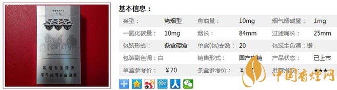 类型 :烤烟型 焦油量 :10mg 烟气烟碱量 :1mg 一氧化碳量 :10mg