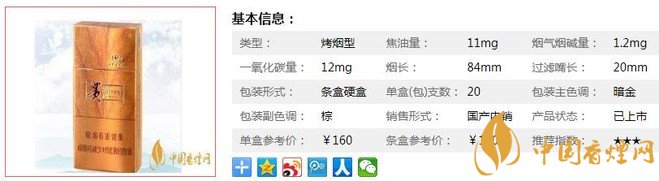 | 类型 :烤烟型 | 焦油量 :11mg | 烟气烟碱量 :1.2mg | 一氧化碳量 :12mg |