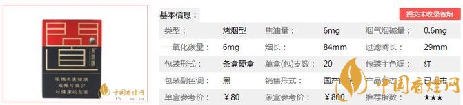| 类型 :烤烟型 | 焦油量 :6mg | 烟气烟碱量 :0.6mg | 一氧化碳量 :6mg |