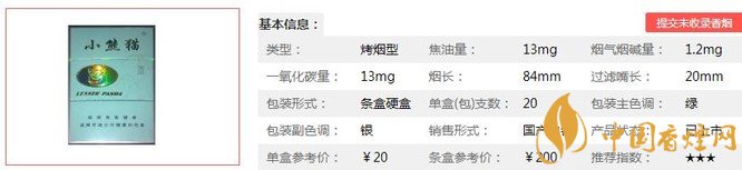 小熊猫绿精品烟支长84mm,过滤嘴长:20mm,烟气较浓,入口微冲,焦油量较高,降焦技术不明显,口感没有想象中淡。下面我们一起来看小熊猫绿精品的参数信息:焦油量:13mg 烟碱量:1.2mg 一氧化碳量:13mg