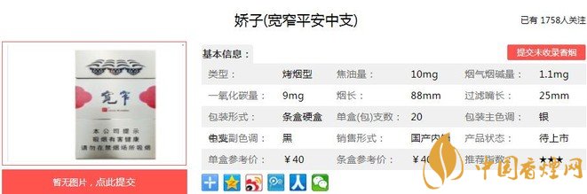 | 类型 :烤烟型 | 焦油量 :10mg | 烟气烟碱量 :1.1mg | 一氧化碳量 :9mg |