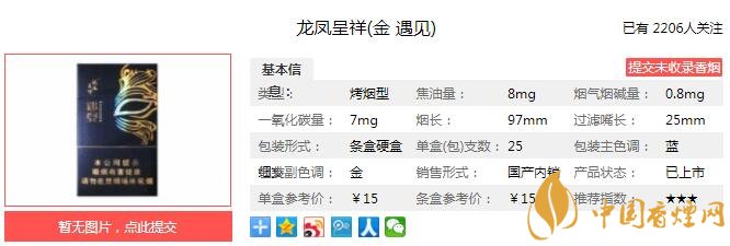 龙凤呈祥金遇见烟支长97mm,过滤嘴长25mm,17mm周长,97mm的细长烟支搭配金色滤嘴,精巧纤雅,传递出了时尚的感觉和品味。下面我们一起来看龙凤呈祥金遇见的参数信息:焦油量:8mg 烟碱量:0.8mg 一氧化碳量:7mg