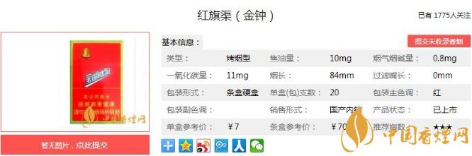 金钟香烟的包装,虽然看上去不像是特别高档的香烟,但是烟嘴看着挺上档次的。在那个年代能有这样的降焦设计,可以说是非常的不错了,满满的科技感。下面便是红旗渠(金钟)的基本参数:焦油量:10mg 烟碱量:0.8mg 一氧化碳量:11mg.