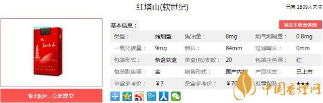 | 类型 :烤烟型 | 焦油量 :8mg | 烟气烟碱量 :0.8mg | 一氧化碳量 :9mg |