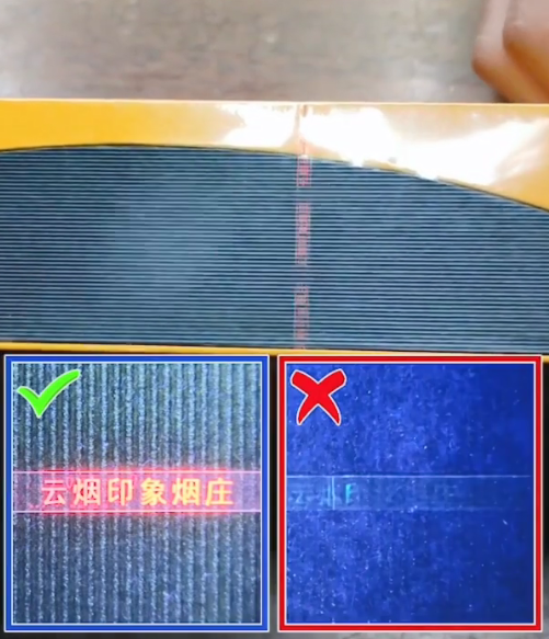 用荧光灯照在烟盒撕口拉线上,真烟拉线有荧光防伪标识,写着“云烟印象烟庄”,而假烟的拉线上没有相应的字样。