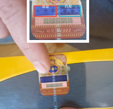 我们可以看到防伪码下面有两排星星,在没有灯光照射的情况下,左边的星星为白色,右边的为黑色,当用紫光进行照射,真烟左边的星星会变成了黑色,右边的变成了白色,而假烟做不出这种效果来。