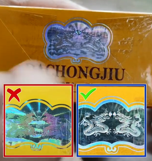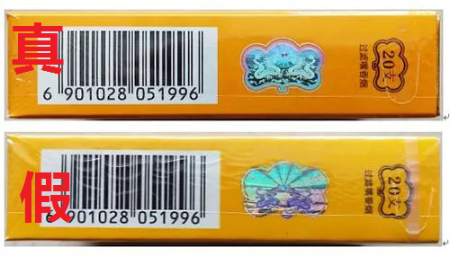可以观察烟盒侧面的镭射防伪标,真烟防伪标图案精致有层次感,其中的“双龙戏珠”图案有凹凸感,图案中的双龙龙鳞排列均匀规则,珠子呈现靓丽锥形;而假烟防伪标做工粗糙,龙图案模糊,颜色不一,没有凹凸感。