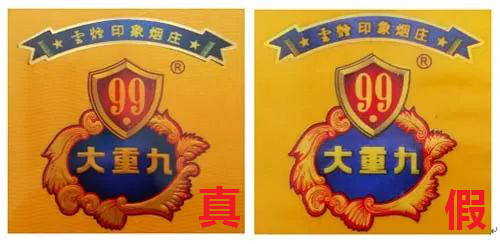1.假冒卷烟“盾牌”、“大重九”、字体、花团图案等商标未做凹凸处理。