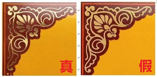 真烟花纹图案烫金色彩明亮,线条凹陷镶嵌在商标纸上;而假烟花纹图案烫金色彩暗淡,线条浮在商标纸上。