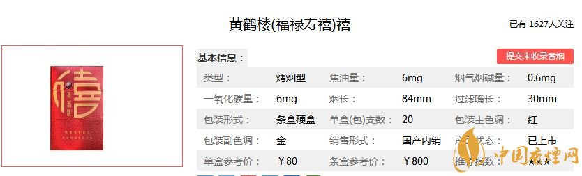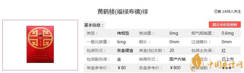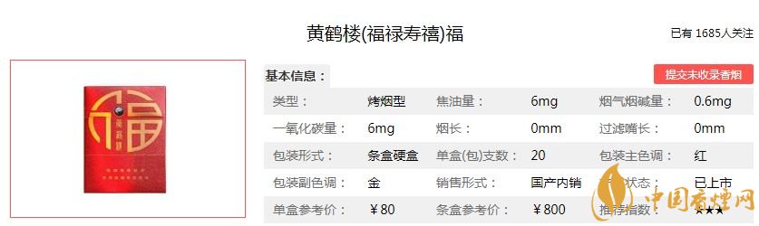 黄鹤楼福禄寿喜四款香烟均采用红底色,金色字外观设计,带给人们喜庆,大气,有档次的品位。烟支规格都为84MM,每条10盒包装,单价均为80元/包。