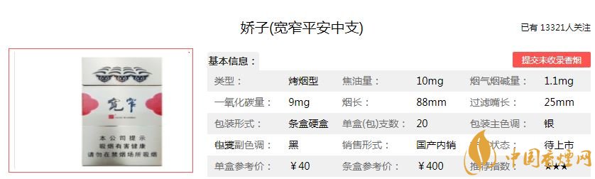 做为宽窄系列家族新成员,娇子(宽窄平安中支)也已登台亮相。在宽版粗支、细支、短支等测试版本之后,最终推出了中支版本的平安,并在2018年惊艳上市。味道传承了宽窄系列的细腻典雅,又有其自身的温润柔媚,是一款质高价美的卷烟产品。经小编市场调查娇子(宽窄平安中支)售价为40元/包。
