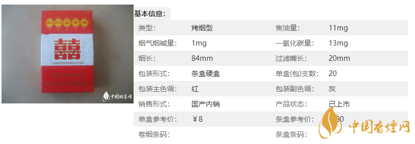 红双喜(硬)包装特点:以中国红为主色调,特大手写体“囍”,突显喜庆、快乐的氛围和理念,蕴涵着向往和积极追求美好幸福生活的深意。