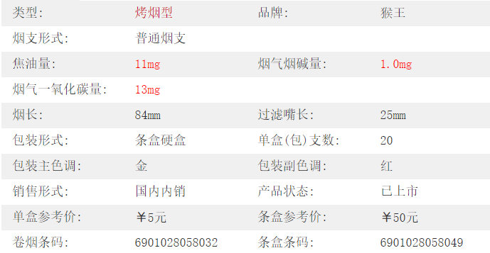 【金色猴王香烟多少钱一包 金色猴王香烟价格表和图片2021】相关推荐文章: