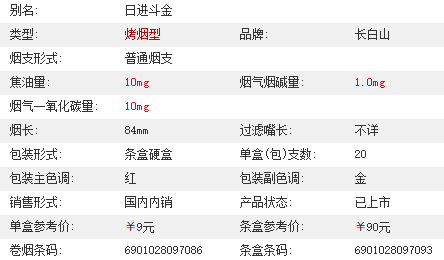 | 类型 :烤烟型 | 焦油量 :10mg | 烟气烟碱量 :1mg | 一氧化碳量 :10mg |