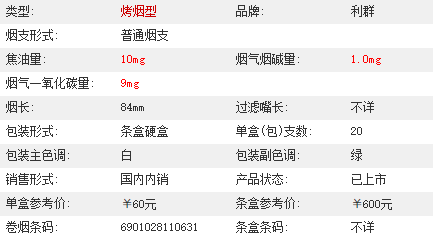类型 :烤烟型 焦油量 :10mg 烟气烟碱量 :1mg 一氧化碳量 :9mg
