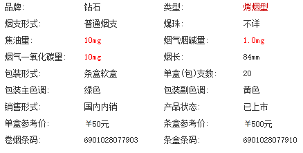 | 类型 :烤烟型 | 焦油量 :10mg | 烟气烟碱量 :1mg | 一氧化碳量 :10mg |