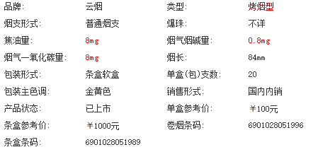 | 类型 :烤烟型 | 焦油量 :8mg | 烟气烟碱量 :0.8mg | 一氧化碳量 :8mg |