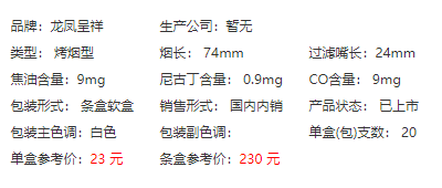 以上是小编整理的有关龙凤呈祥蝶恋花香烟价格和龙凤呈祥蝶恋花2021价格的相关资料信息,希望能够对大家了解相关情况有所帮助,想获得更多消息资讯请关注jrs直播!