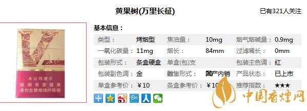 | 类型 :烤烟型 | 焦油量 :10mg | 烟气烟碱量 :0.9mg | 一氧化碳量 :11mg |