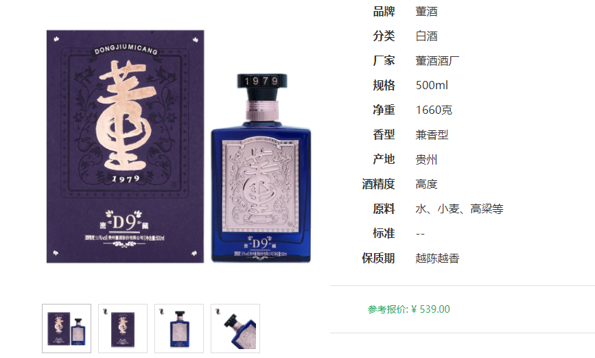 董酒密藏D9,包装采用神秘高贵的紫色,烫金本草纹萦绕瓶身,以香水瓶的形式,呈现稀世之貌。盒身与瓶身皆有1979标志,代表董酒第二次获得名酒称号的年份。内置精美手提袋,馈赠佳品,满足您高端商务赠送,团圆宴请,过节走亲访友,自饮珍藏都是高端大气的选择。董酒密藏D9属于董酒密藏系列高端产品,市场零售价格在每瓶500元左右,很是适合高端消费,全国各大批发市场均有销售。
