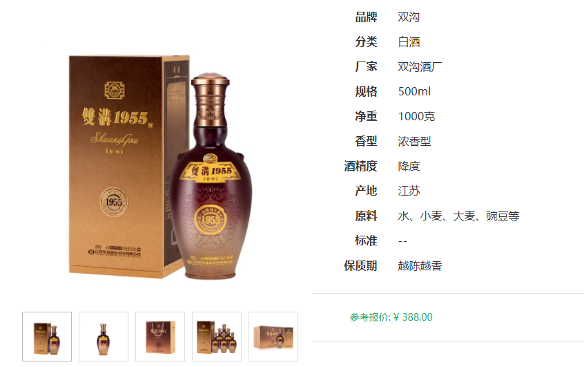 江苏省双沟酒1955金标42°度浓香型纯粮食白酒500ml*6瓶一整套装的京东官方价格是2322元,一瓶装的官方零售价格大概388元。双沟1955金标42度怎么样呢?接下来详细给大家介绍。