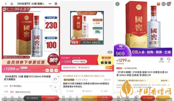 事实上,由于茅台价格持续拉高,从而为五粮液、泸州老窖等一线酒企的高端产品让出价格调整空间。但细观消费市场,国窖1573的价格并没有完全突破千元。北京商报记者发现,52度500ml国窖1573经典装官方旗舰店原价1499元/瓶,活动售价1299元/瓶。反观其他电商平台,该产品活动售价大多在1000元左右。其中,天猫旗舰店此前售价为1299元,活动售价仅969元;1919平台此前售价为1399元,活动售价999元;酒仙网、苏宁易购等活动售价为909元和969元。