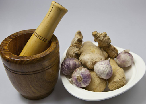 将独头蒜、生姜切片直接泡在白酒里,两周后服用。