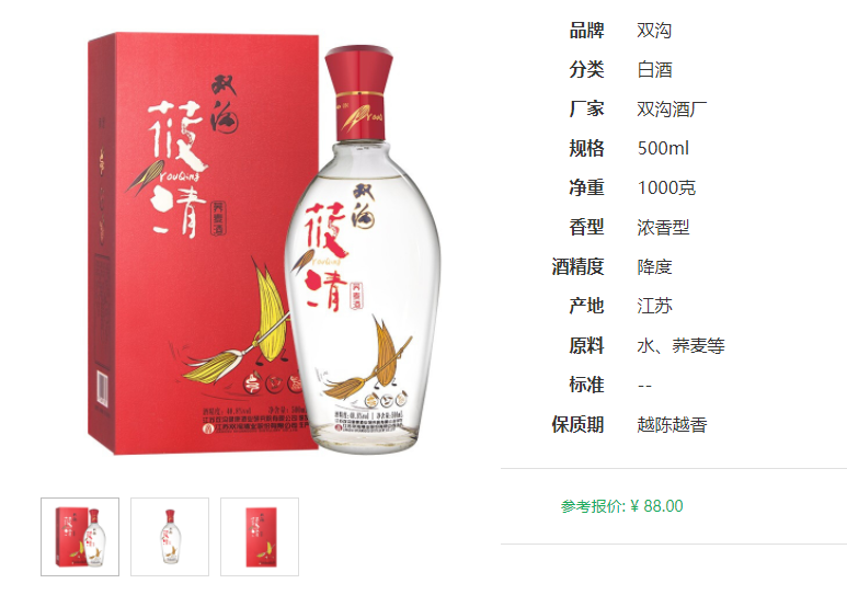 双沟莜清酒是江苏洋河酒厂股份历时五年研制而成的新品,是一款健康、养生的新型白酒,具有养心护肝降三高的特点。双沟莜清系列产品在市面上流通的主要分为双沟莜清(荞麦酒)、双沟莜清(燕麦酒)、双沟莜清(莜麦酒)三款。