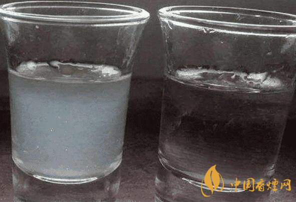 将酒倒入杯中,然后兑水,如果是纯粮酒,则会出现失光、浑浊的现象,这是因为粮食酒中有些物质不溶于水,只溶于酒,加水后度数下降,水增多,这些物质就会析出,导致酒液浑浊;如果是酒精酒,则不会出现这种现象。