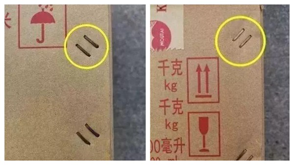 2、2014年底之前外箱卡钉方向为左上向右下拉一捺,之后为右上往左下拉一撇。