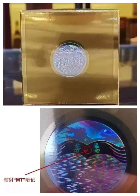 1、酒盒顶部茅台logo中间有镭射“MT”暗记,同时可以看到很多荧光光斑。