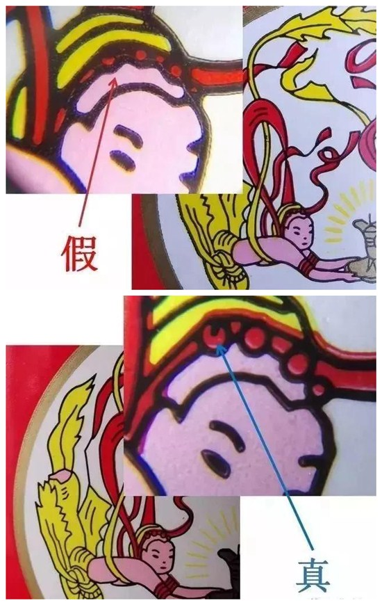 1、2017年至今的左边的仙女头巾装饰上靠左边的一颗珍珠内有一黑点暗记,没有暗记则为假。