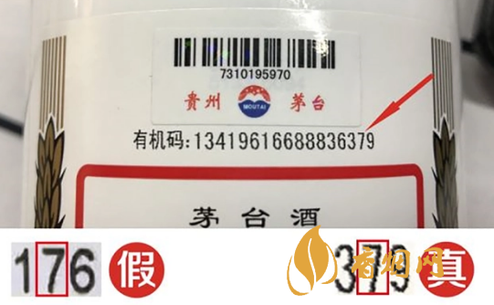 茅台背标上的有机码是喷涂上去的,摸起来有凹凸感。其最明显的“暗记”在有机码的数字“7”上。真品的“7”第二笔笔画倾斜幅度不大,且线条笔直。