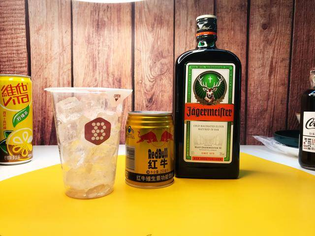 5、红牛野格 用炸弹杯装满冰冻野格,然后用哥伦杯倒扣并封闭上炸弹杯,将整个哥伦杯底部放置桌上后,倒入冰冻红牛(这种喝法,我个人也比较喜欢,边喝边有野格的味道溢出,口感超好)