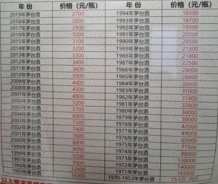依据当前市场行情来看,肯定是偏低的(别个回收酒商也要赚钱的),所以大家可以再以上的基础上,各个年份再添加500-1000元,可能就是目前市面上对外销售的价格,大家根据自己的判断来定: