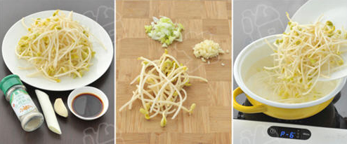 绿豆芽100克、蒜5克、葱5克、白胡椒粉、生抽、盐2克