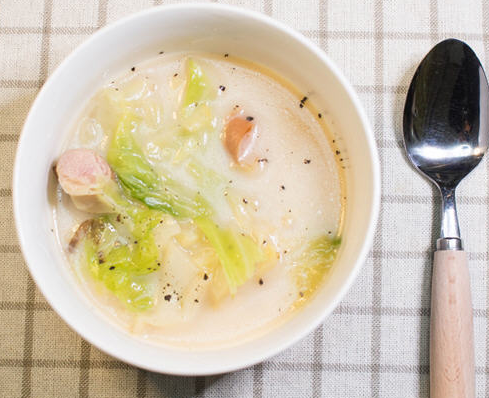 主料:高丽菜100g、鑫鑫肠50g、水200cc、牛奶200cc、鸡高汤块2颗