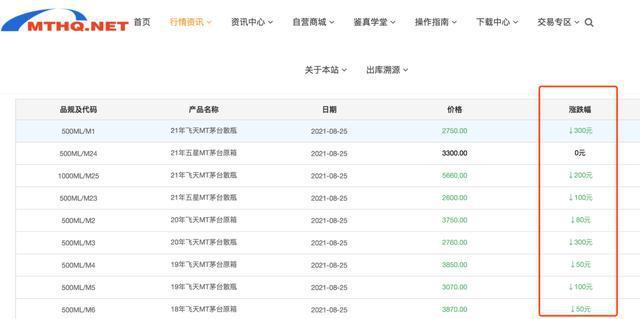 茅台行情网显示,今日21年飞天MT茅台的最新价格为2750元,跌去300元。