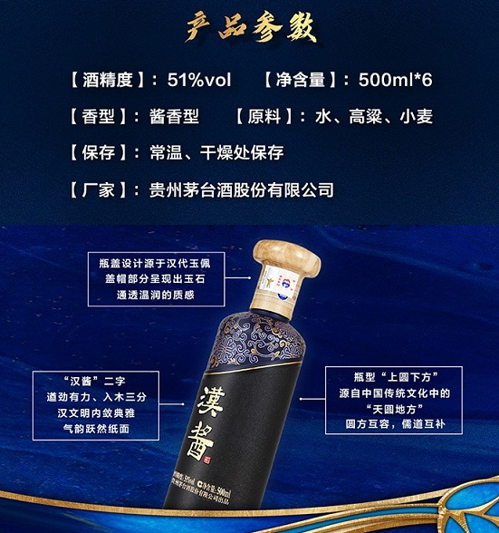 汉酱酒(茅),汉酱系列高端产品,51度500ml整箱6瓶装,京东自营旗舰店单瓶售价898元。适合高端商务招待、礼品馈赠、收藏等。