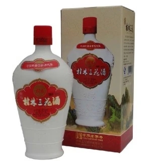 52度桂林三花酒,这是一款以大米为原料的白酒。使用的是漓江泉水,在酿造过程中,在陶坛中先是经过了自然发酵,再三蒸三熬,使酒体更加醇和芳香。
