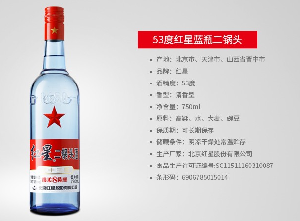 红星二锅头绵柔8是红星股份有限公司出产一款清香型的亲民光瓶产品。北京红星股份有限公司始建于1949年5月,是著名中华老字号企业和国家级非物质文化遗产保护单位。这款产品采用经过精挑细选的优质高粱、玉米、大麦、豌豆,再配以当地的优质水源,然后严格遵循国家级非物质文化遗产的“北京二锅头酒传统酿造技艺要求精心酿造而成。首先进行清蒸清烧,然后用老五甑工艺进行蒸馏,最后掐头去尾截取中段,留存第二锅酒,进行长年窖存。红星拥有蓝瓶、苏扁、青花瓷等系列产品,价位低廉。红星蓝瓶二锅头,外号蓝八,酒质清澈透明,气味香馥,醇厚甘冽,清香纯正,回味悠长。