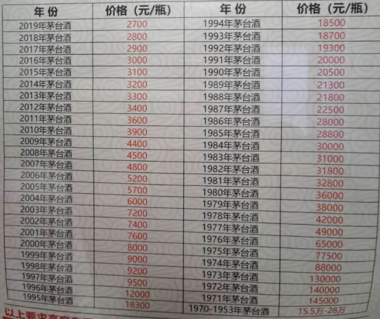 上图中广告的价格,依据当前市场行情来看,肯定是偏低的(别个回收酒商也要赚钱的),所以大家可以再以上的基础上,各个年份再添加500-1000元,可能就是目前市面上对外销售的价格,大家根据自己的判断来定。