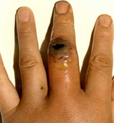 人若感染后,以皮肤炭疽最常见,可占到95%以上,多发生在手、脚、面部、颈肩部等裸露的皮肤上面,会出现红斑或丘疹(类似于蚊虫叮咬的包块),然后出现水泡,水泡中间坏死形成溃疡性黑色焦痂。通常,病人一般会有发热和寒战寒颤,还有咳嗽、吐痰、呼吸困难、脾脏肿胀等症状。