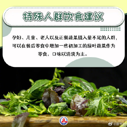 孕妇、老人、儿童以及正餐蔬菜摄入量不足的人群,可以在餐后零食中添加一些初加工的绿叶蔬菜作为零食,口味以清淡为主。