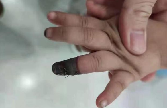 期间,家长见纱布没再滑落,也放心没再多管,既没为欢欢更换创可贴,也没再观察手指状况。直到3天后,欢欢的爸爸出差回家后发现不对劲,一撕开创可贴、纱布,所有人大吃一惊,欢欢的无名指肿胀严重,且手指末端已经发黑。大家这才慌了神,立马抱着欢欢去医院,但因为太严重,医生建议转往专业的手外科治疗。