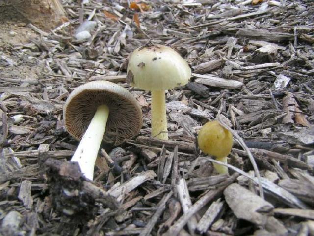 毒鹅膏菌和某些可食用蘑菇的长相有些相似,菌肉、菌褶和菌柄为白色。菌柄上部有白色的菌环,其菌盖随着生长周期的变化,会呈现出灰褐绿色、烟灰褐色、暗绿灰色。