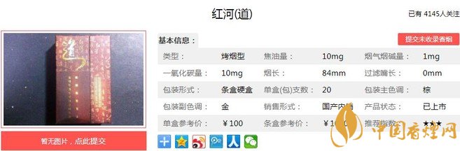 红河道烟支长84mm,过滤嘴长35mm,烟支造型是不太常见的小方格,烟丝填充饱满。烟嘴、烟支的包装工艺都是首屈一指,高端产品的形象一览无遗。下面我们一起来看红河道的参数信息:焦油量:10mg 烟碱量:1.0mg 一氧化碳量:10mg