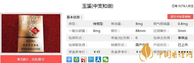 玉溪中支和谐是红塔集团高端突破的重点规格新品,产品传承中国传统文化理念,兼具中支和爆珠两种创新品类特质,使枇杷爆珠的果香与烟草本香相得益彰,吸味清香、甜润舒畅、平衡舒适。经jrs直播小编市场调查玉溪中支和谐售价为45元/包。