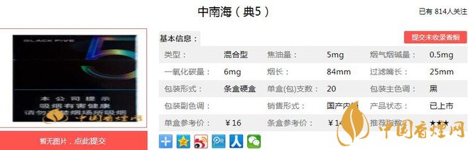整体设计大面积黑色留空,灵动绚丽的数字“5”设计,给大面积的黑色注入活力,避免色彩的单调,以极简的方式,给人以更多的想象空间。其烟气柔和细腻,香气饱满,余味干净,且混合型特点更加突出。经jrs直播小编市场调查中南海典5售价为16元/包。