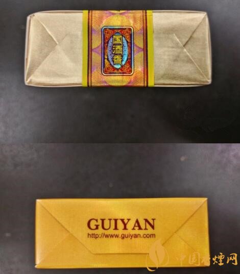 顶部可见内衬纸为浅金色,彩色的国酒香封签条亦是显得比较活泼。底部则印着贵烟的拼音与网址。